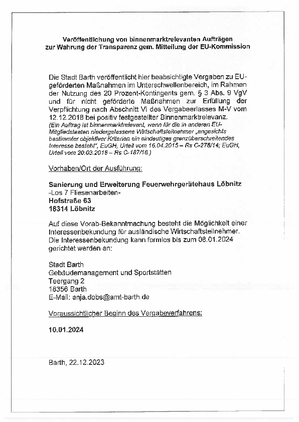 Veröffentlichungsvermerk: Die vorstehende Bekanntmachung wurde am 22.12.2023 im Internet auf der Seite www.amt-barth.de veröffentlicht.