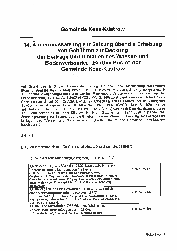 Gemeinde Kenz-Küstrow, Bekanntmachung 14. Änderungssatzung der Satzung über die Erhebung von Gebühren zur Deckung der Beiträge und Umlagen des Wasser- und Bodenverbandes "Barthe/Küste" der Gemeinde Kenz-Küstrow