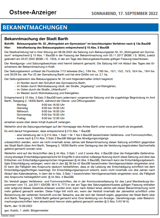 Veröffentlichungsvermerk: Die vorstehende Bekanntmachung wurde am 19.09.2022 im Internet auf der Seite www.amt-barth.de veröffentlicht.
